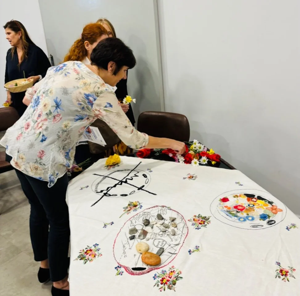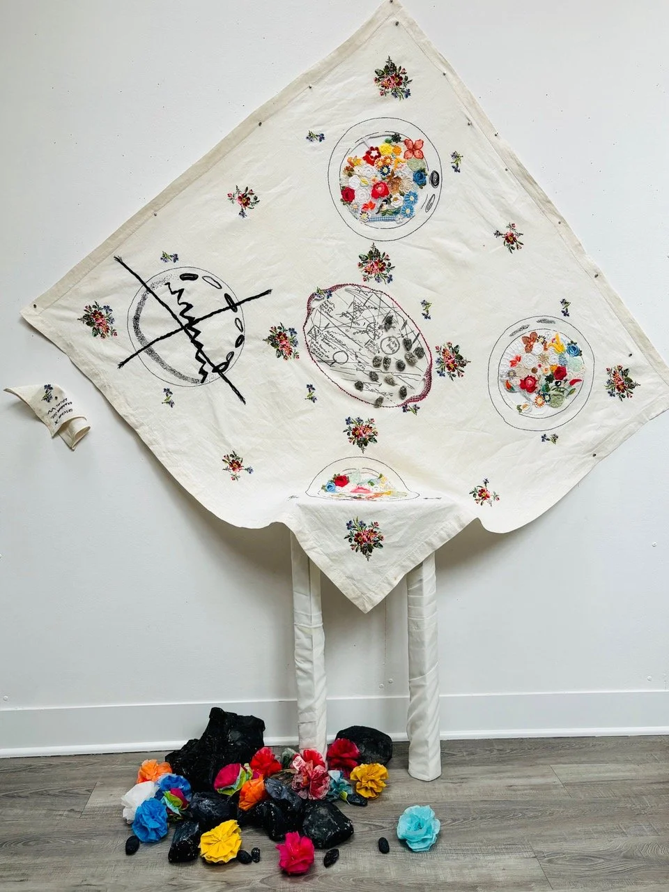 Stones of loss, flowers of life—an installation of memory, color, and enduring human essence.